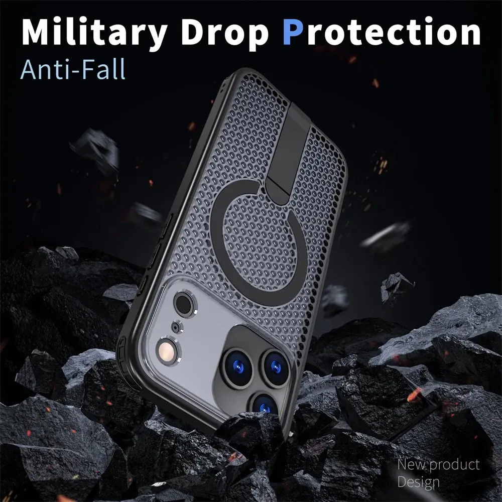 جراب آيفون متوافق مع MagSafe مزود بمغناطيس قوي وحامل خلفي قابل للطي، يوفر حماية كاملة للهاتف مع تصميم يساعد على تبديد الحرارة وحماية الكاميرا من الخدوش.